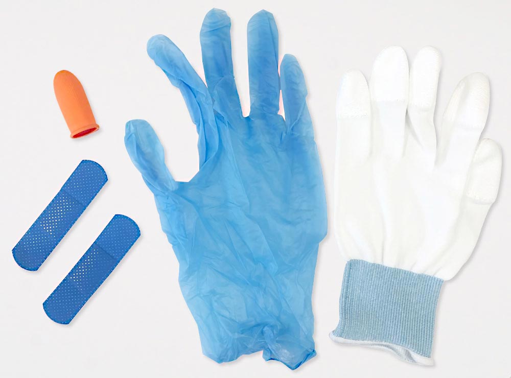- 作業開始時、終了時に手袋が破損していないか、指サック・傷テープを紛失していないか確認し、ライン担当者に報告する。